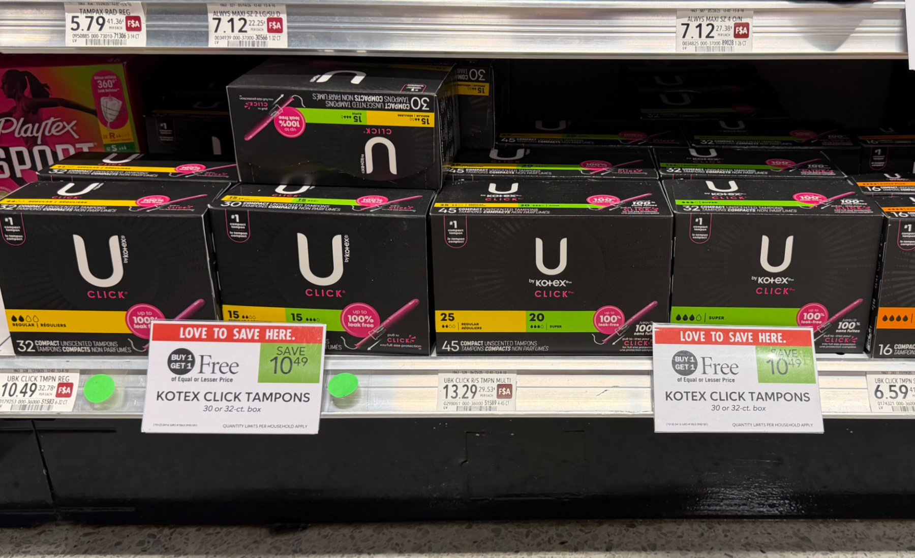 Kotex Pads, 50 or 56 ct, or Overnight Pads, 28, 36, or 39 ct; or Click Tampons, 30 or 32 ct, (Excluding 28 ct Teen Pads), BOGO $10.49 – $10.99