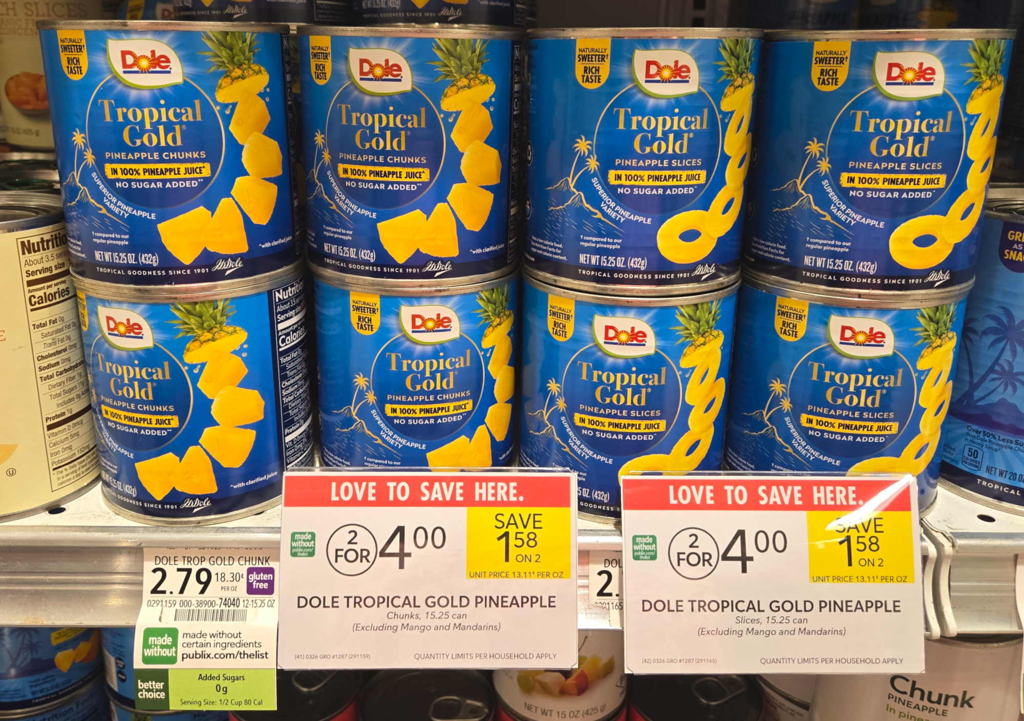 Grab a discount on the cans of Dole Tropical Gold Pineapple when you shop at Publix. Clip the cash back offer and pay just $1.25 per can… that’s a great price for canned fruit!